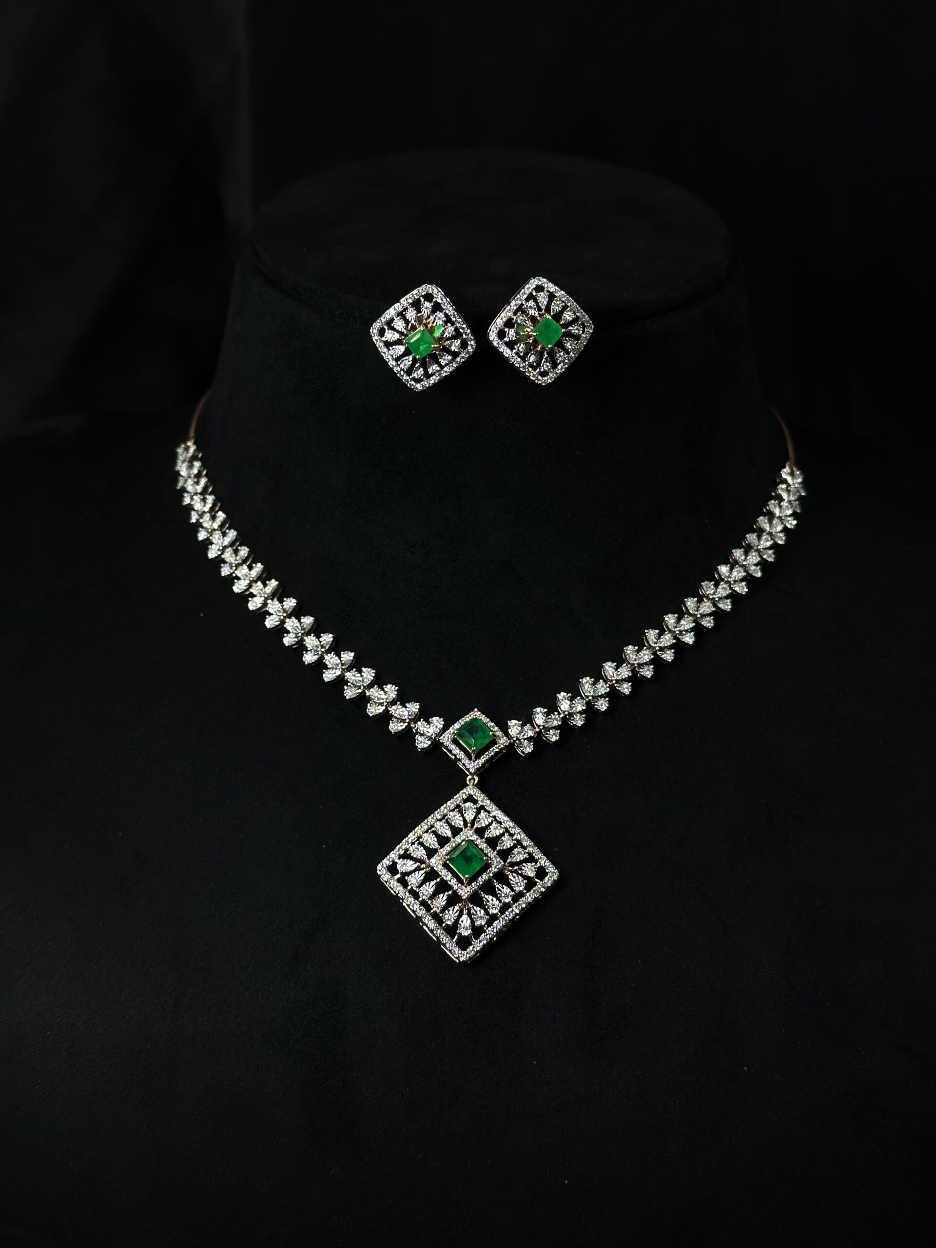 A stunning fusion of elegance and edge – this necklace dazzles with square emerald motifs surrounded by brilliant diamonds. A perfect blend of grace and glamour for your light occasions.