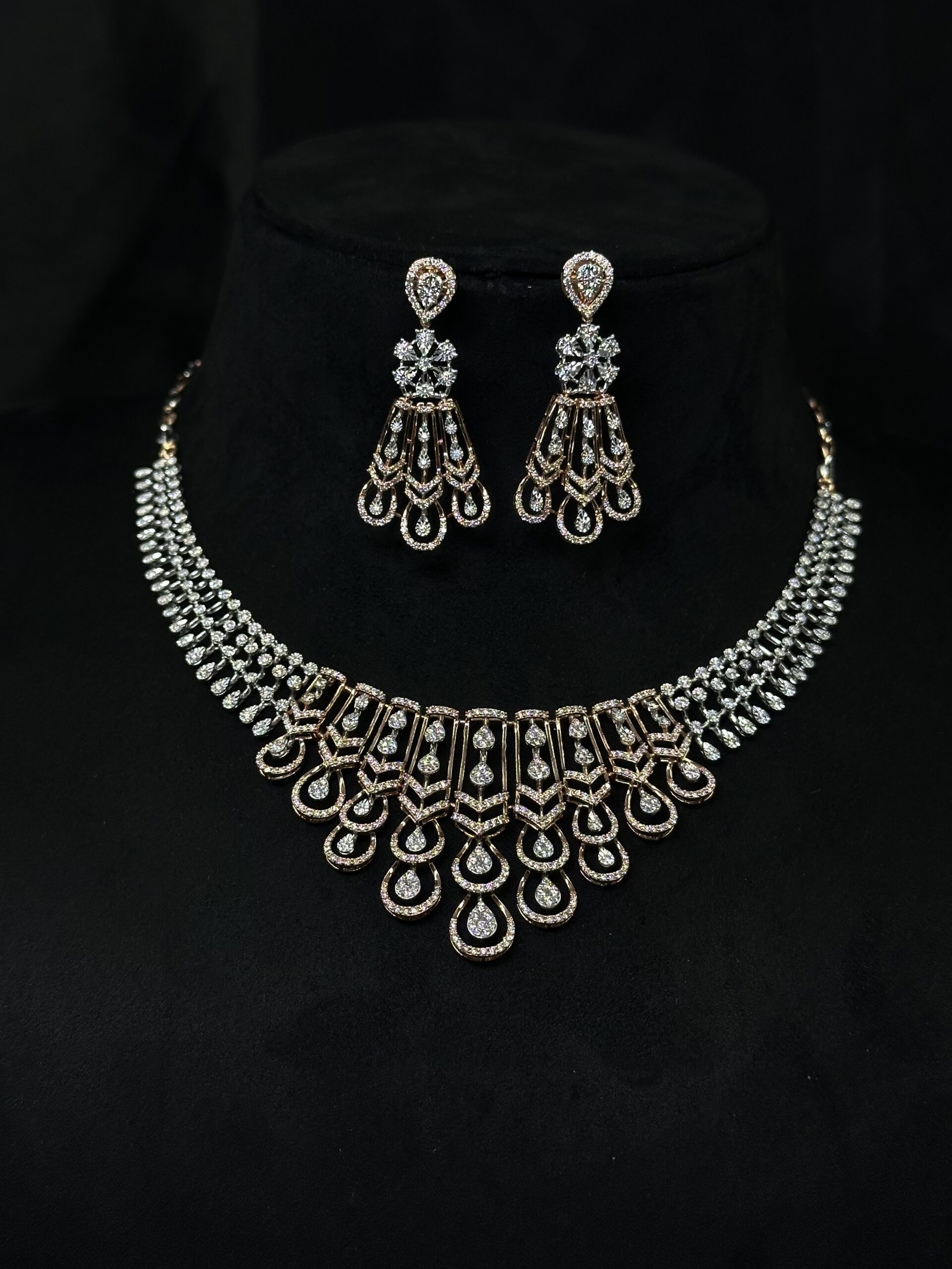 A pear shaped diamond studded necklace with a tinge of green emeralds suitable for medium to heavy functions.